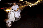 shoes, her navy blue veil flapping behind her as she zips along on her