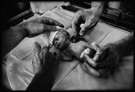- A new-born baby is being examined. It weighs 660 gram- Ce nouveau-né est examiné. Il pèse 600 grammes.